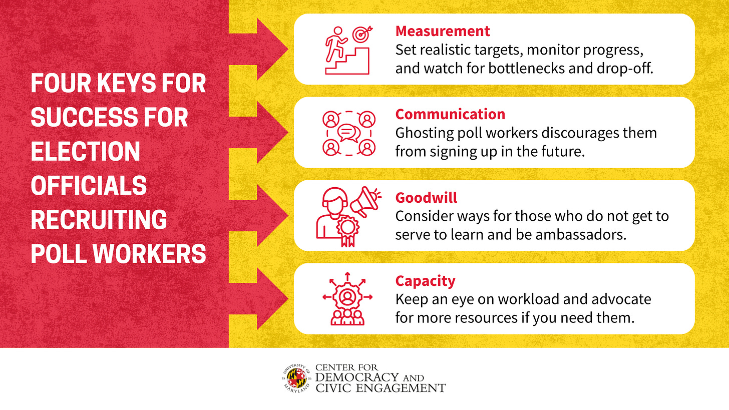When your pipeline is full, stop recruiting: Time and again, we hear voters say “I signed up to be a poll worker, but they never called me back.” Make sure that you have the capacity to train, assign and communicate with those who have already applied. Ghosting potential poll workers discourages them from signing up again in the future.