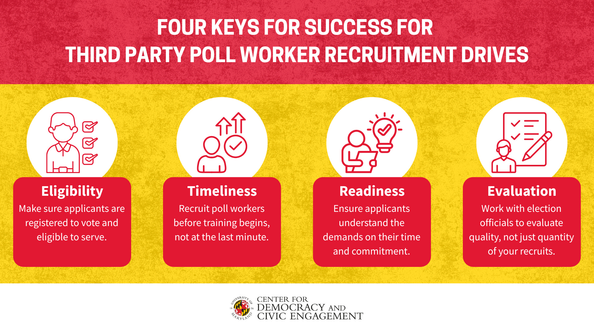 Ensure eligibility: In many states, poll workers need to be registered to vote in that state by a particular date, be of a certain age, have certain skills or physical abilities, or meet other eligibility requirements in order to serve.